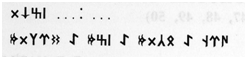 This is a vertical inscription consisting of 20 signs, the length of the line is 27,7cm, the height of the characters is 1,0-2,3cm. It was discovered by V.D. Kubarev in 1987. Д. Д. Vasil’ev considers Kalbak-Tash XXIII and XXIV to be one inscription consisting of two lines. In the first line (corresponding to Kalbak-Tash XXIV), he could recognize only 4 runes, but he could not read them correctly; in the second line (corresponding to Kalbak-Tash XXIII), he saw 18 signs. The inscription has number А-47 in his publications. In his article, D.D. Vasil’ev used a copy of V.D. Kubarev (Kubarev & Jacobson 1996: fig. 384).